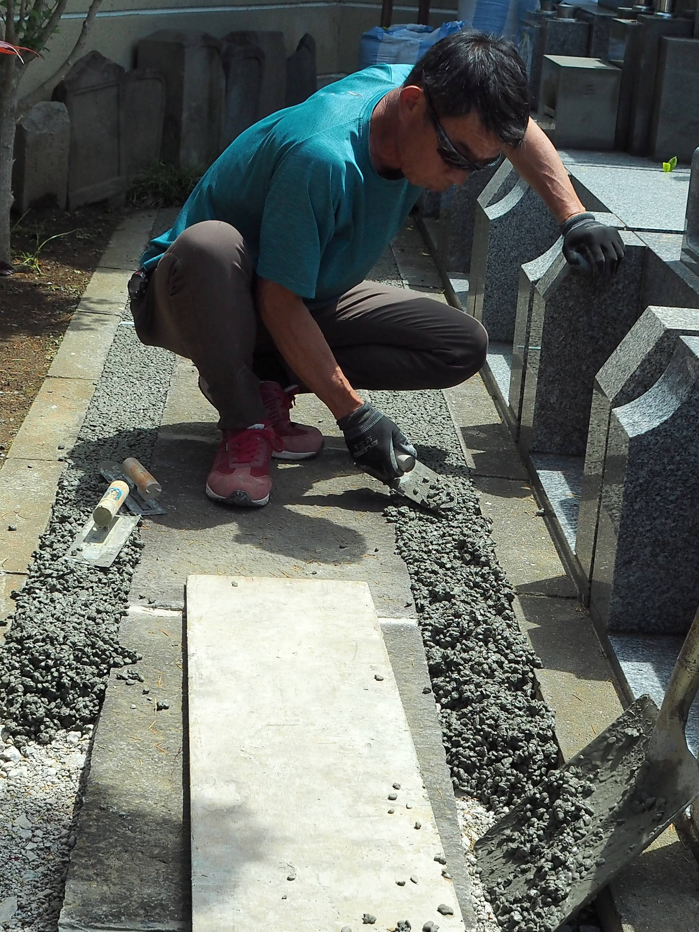 混錬されたブミコンは一輪車で施工場所に運ばれます。施工は人力によるコテ仕上げなので、様々な場所でフレキシブルに対応できます。入り組んだ墓所の通路の施工には最適ですね。