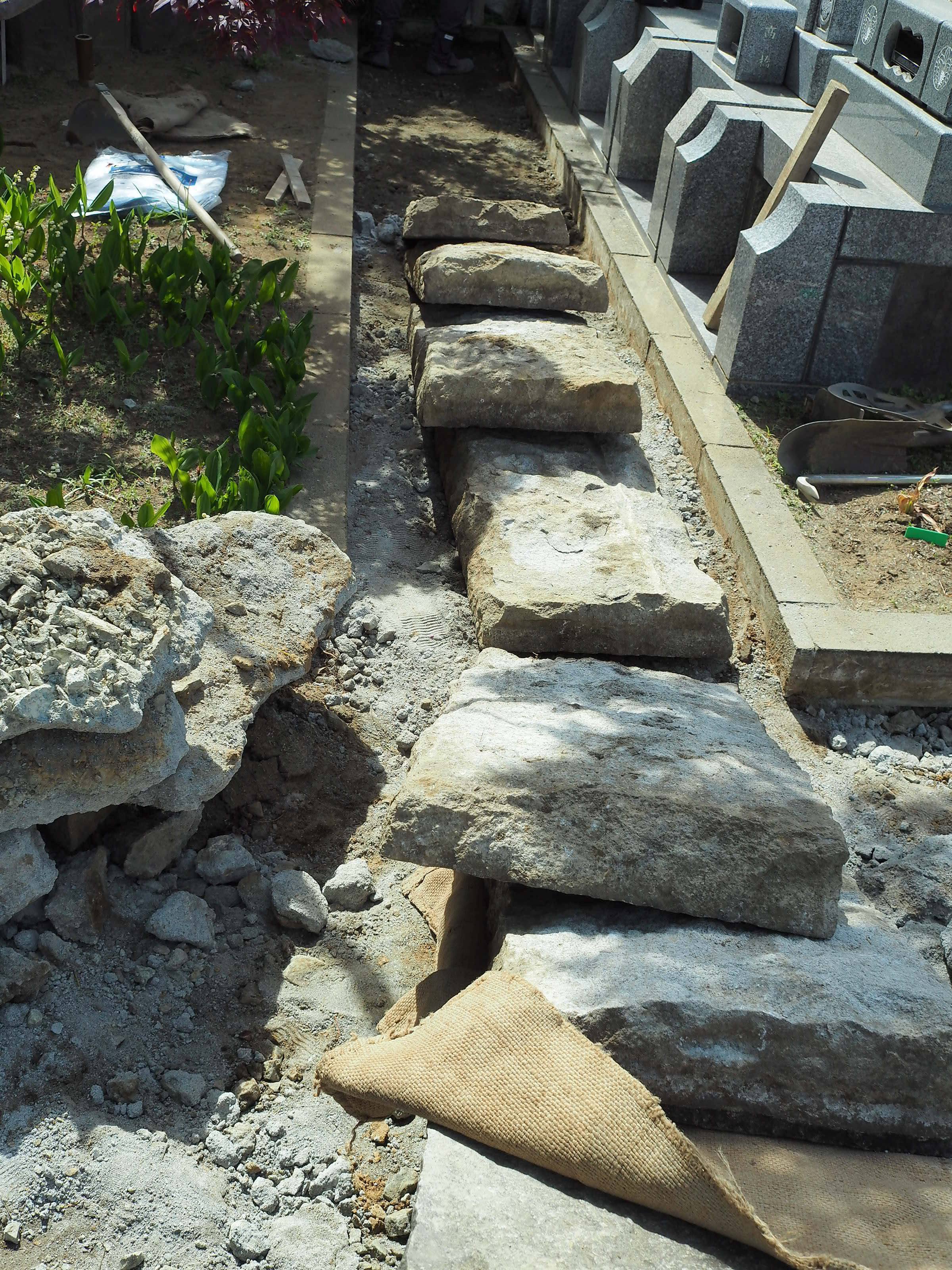 今回お仕事をさせていただくのは墓所の別の区画です。まずは敷石をはがして、ブミコンの下地路盤を作ります。敷石は掘り起こしてみると石の厚みに驚きますね。