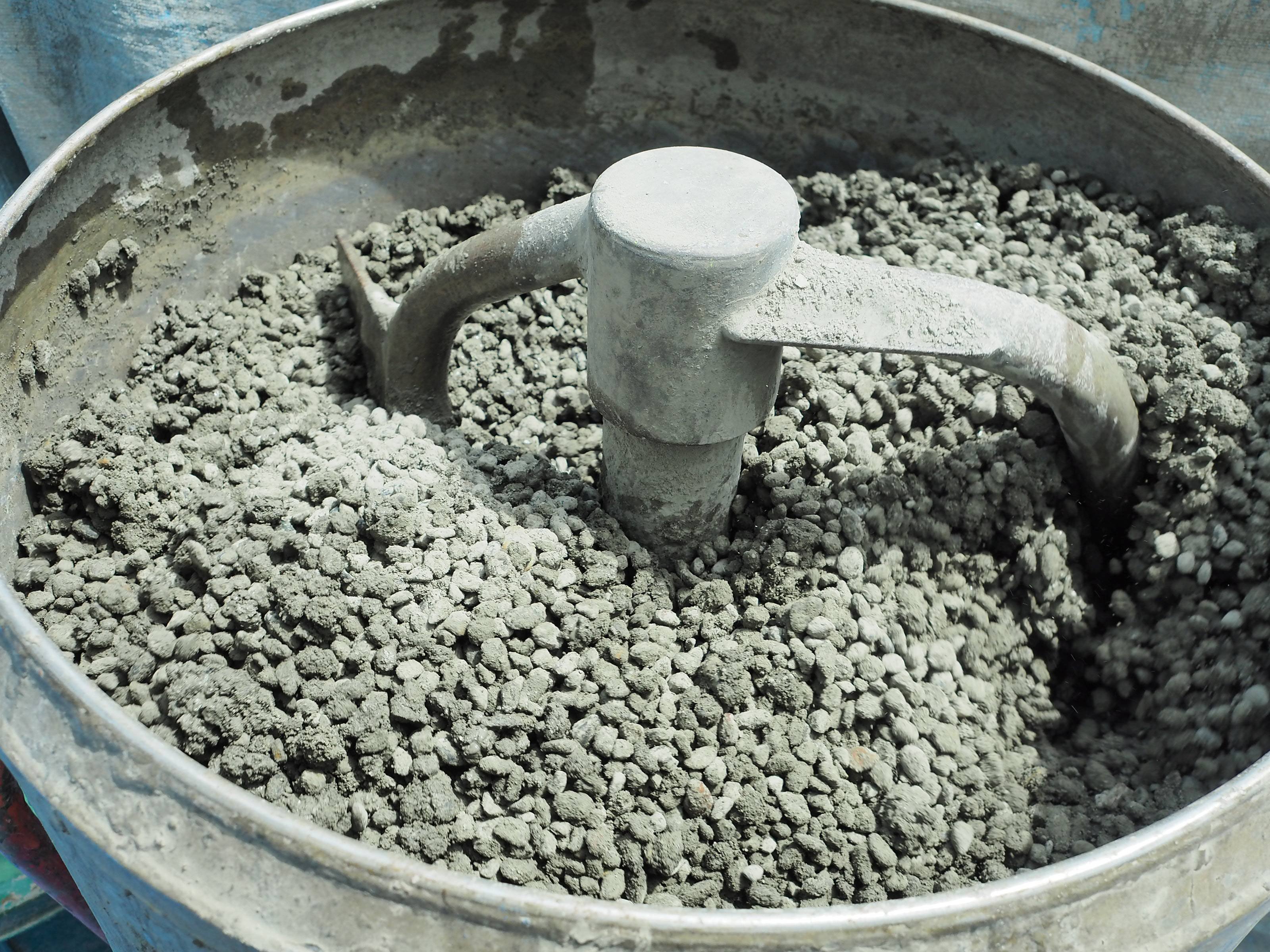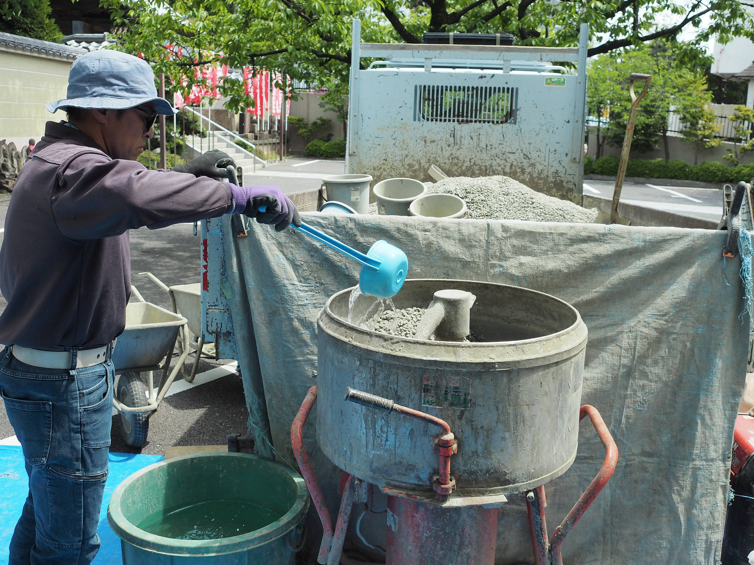 常楽院様墓所1区のブミコンの施工が始まりました。今回はパン型ミキサーを使用してBGパウダーと砂利をバケツで計量して混錬します。