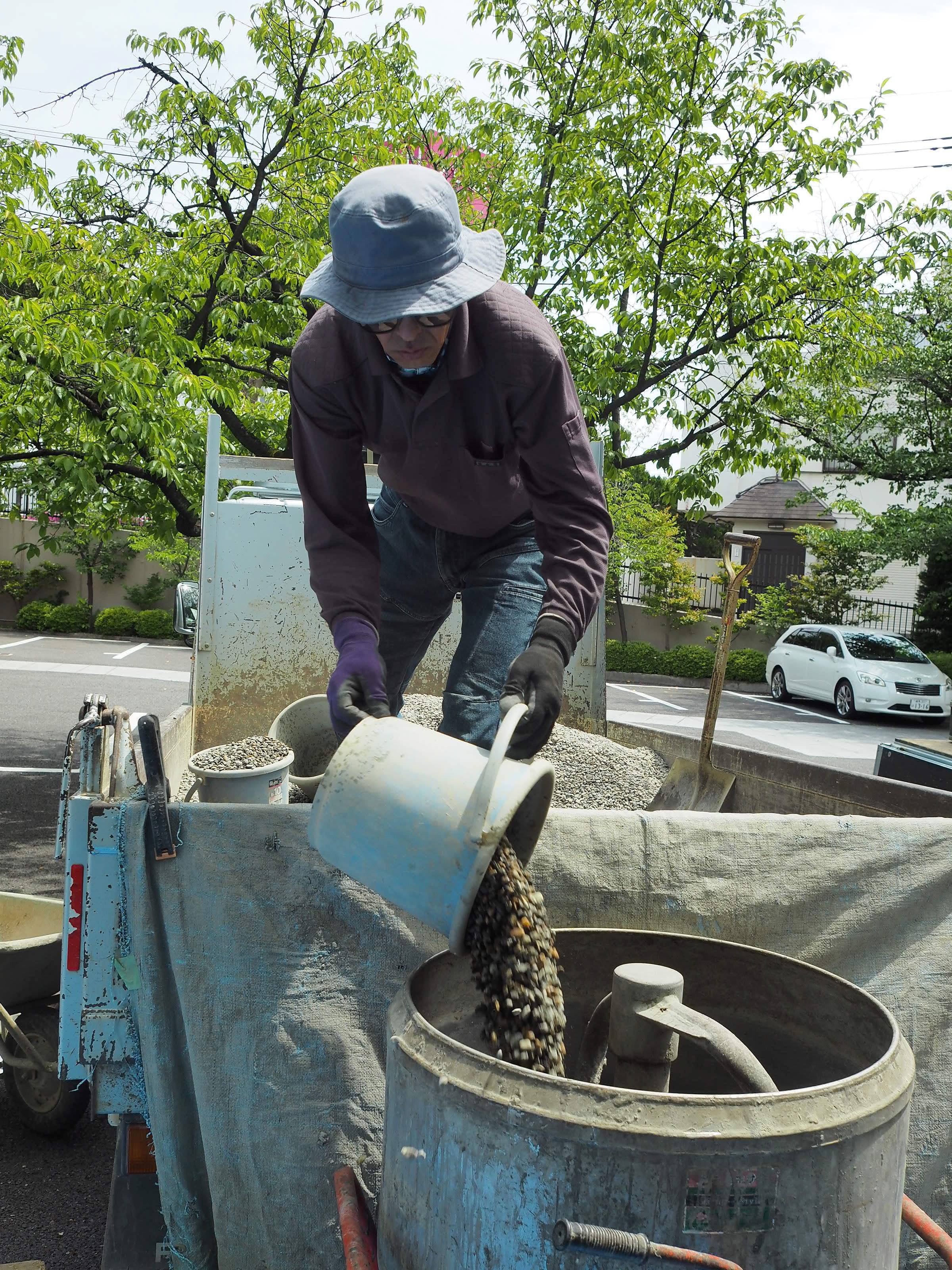 ブミコンを調合するのに大事なことは水量の調整ですが、その日の天候や砂利の濡れ具合に対応しながら柄杓で水量をコントロールします。